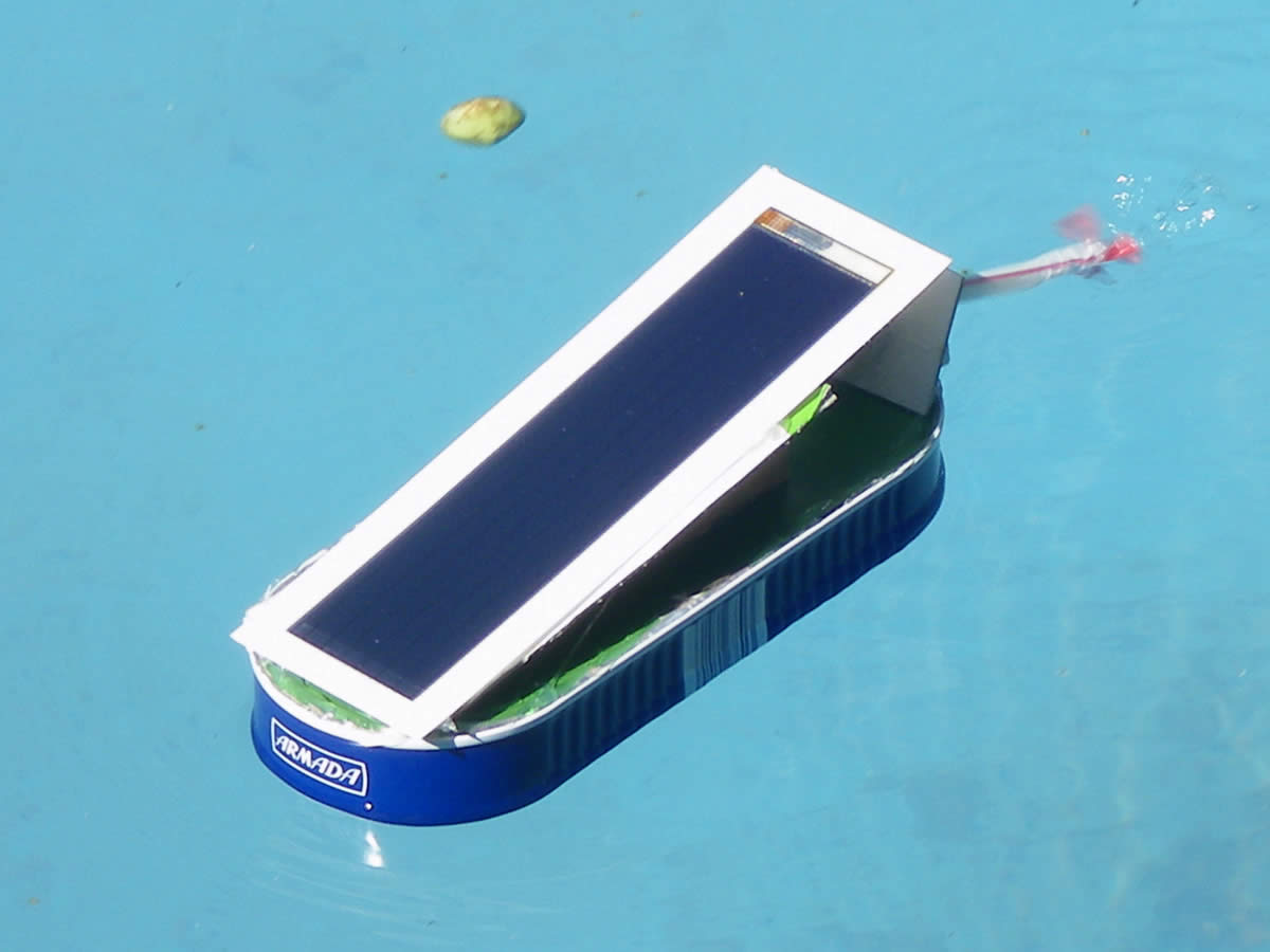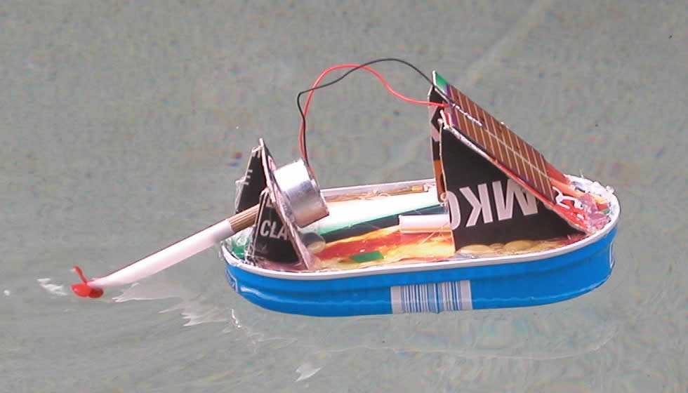 Aus einer Fischdose und Karton mit Solarteilen bauen die Kinder ein schwimmfähiges Solarboot, das unter der kostenlosen Kraft der Sonne im Wasser seine Runden dreht.